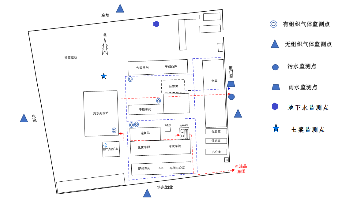 污水總排口一個(gè),位于廠(chǎng)區(qū)東側(cè)外墻外,大氣排放口共5個(gè),其中污水處理1個(gè),氯化2個(gè),干燥1個(gè),包裝1個(gè) |